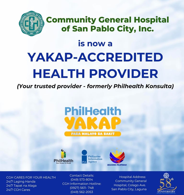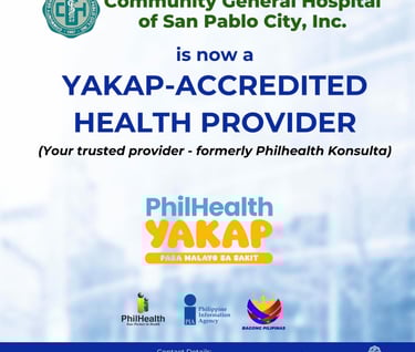 Magandang balita para sa mga San PableΓ±o! Ang Community General Hospital of San Pablo City, Inc. ay opisyal nang kinilala bilang PhilHealth YAKAP Accredited Health Facility.