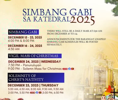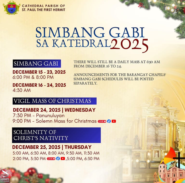 SAN PABLO CITY, LAGUNA β Inaanyayahan ng Cathedral Parish of Saint Paul the First Hermit ang lahat ng residente at bisita ng lungsod na makibahagi sa taunang pagdiriwang ng Simbang Gabi, isang tradisyong Pilipino bilang paghahanda sa kapanganakan ng Panginoong Hesukristo. Ang mga misa ng Simbang Gabi ay gaganapin mula Disyembre 15 hanggang 23, 2025, sa ganap na 6:00 PM at 8:00 PM, habang ang mga umaga na misa mula Disyembre 16 hanggang 24, 2025 ay sa ganap na 4:30 AM at 6:30 AM (Community Mass).
